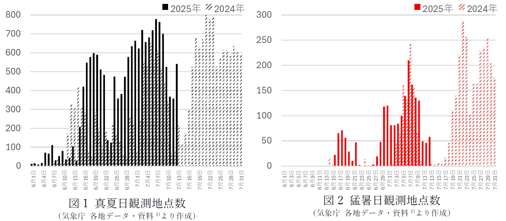 今年も連日、猛暑が続いています。 皆様、ご体調はいかがですか? そう言えば、昨年も暑い日が続いていた様な気がするのですが…。 そこで、昨年と今年の真夏日(図1)・猛暑日(図2)の観測地点数を確認してみました(確認日 20 …