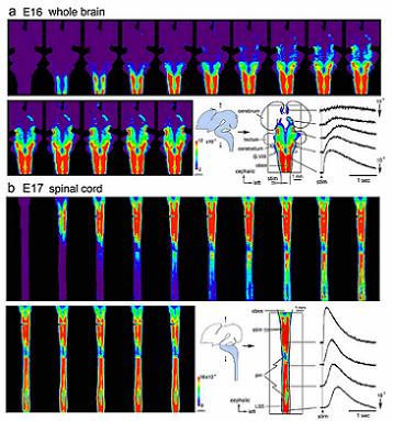 写真2:ラット胚の脳(a)・脊髄(b)における神経活動の伝播パターンのイメージング。