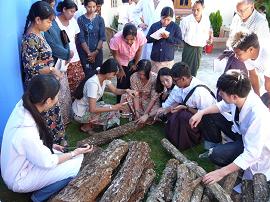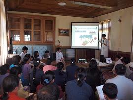 今回のセミナーでは、「ミャンマーの地に即したシイタケの原木栽培法の提案」をメインテーマに、パワーポイントを用い、学生たちにより詳細な解説がなされた。実習も合わせて行われ、現地の人たちとボディランゲージを交えての真剣の中にも微笑ましい交流がなされた。