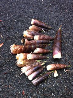 当日、お父様からレクチャーを受けたのちに、裏山を散策しながらタケノコを探しては掘る作業を繰り返し、わずか30分程度でごらんのとおりたくさん収穫できた。学生だけでなく、私自身も初めての経験で、とても楽しい時間を過ごすことが出来た。こんな時はさすがに学生の目つきが違うことがよくわかった。