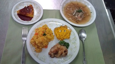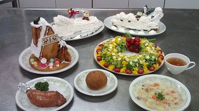 今年の特徴は、あまり時間の制約のないゼミならではの内容が多く、通常の調理学実習など課程内の実習ではできない、手間のかかる行事食にチャレンジしたことです。写真は、10月のハロウィンメニューと12月のクリスマスメニューです。クリスマスメニューは特に気合が入っていました。お料理や2種のクリスマスのお菓子はもちろん、ゴマ入りパンも手作りですよ。
