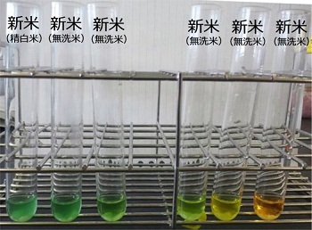 授業の一環で毎年米の品質評価を行っていますが、一般的な精白米のpHは中性(緑色)で新鮮なのに比べ、約8割の無洗米は古米や保存状態の悪い米と同様に酸性(黄色〜赤色)を示します。ここからは個人の私見ですが、米は自給率が高い反面売れ残り易く古米になるため、無洗米などに加工し販売しているのではないかと推察しています。