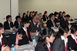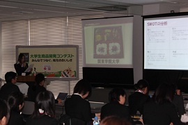 プレゼンを行うにあたり、説明会からコンセプトシートによるやりとり、そして、(株)サークルKサンクス晴海本社で、大学生商品開発コンテストのプレゼンテーションが行われました。提案弁当は前日授業終了後に3個(展示用、プレゼン用、審査用)作り、プレゼン当日持参しました。参加校は11校、各大学ともすばらしい商品で、独創的な商品も提案されていました。審査結果は残念ながら8位に終わりましたが、学生たちは一生懸命に取り組み、プレゼンテーションも堂々と行われました。
