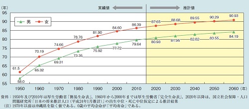 日本の高齢化率は世界トップであり、65歳以上の高齢者は全人口の23%に達した。平均寿命も同じく世界一であり、男性79.6歳、女性86.4歳であり、間もなく男女ともに平均寿命が80歳を超える日がやってくる(グラフ参照)。