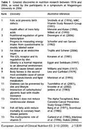 「Which are the greatest recent discoveries and the greatest future challenges in nutrition?(栄養学における最も偉大な発見は何か。そして最も重要な今後のチャレンジは何か。)」? これは、European Journal of Clinical Nutrition 63: 2-10 (2009)に掲載されたreviewのタイトルで、2006年にオランダWageningenで開催されたあるシンポジウムでの興味深い投票結果を報告 しています。このシンポジウムは、140人あまりの栄養学者とその関係者からなる小規模な集いでしたが、いわばその余興として、「What has the field of nutrition research achieved in the way of new discoveries since 1976?(1976年からの30年間になされた新発見)」と「What are the greatest challenges of the coming 30 years?(今後の30年における最も重要なチャレンジ)」の2点について、参加者のディスカッションと投票が行われました。1番目の問いに関する結果 は、添付の表に示されるとおりです。第1位に選ばれたのは、「Folic acid prevents birth defects(葉酸は先天性奇形を防止する)」でした。妊娠中に葉酸が欠乏すると、神経管閉鎖不全という奇形を生じることが知られており、妊婦に十分な 葉酸の摂取を促すのは現在ではなかば常識になっていますが、このような知識も過去における偉大な発見のたまものであったわけです。