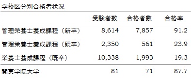 2014.05.17 お知らせ 管理栄養士国家試験合格率は87.7%でした。 第28回管理栄養士国家試験(平成26年3月23日実施)の合格発表(平成26年5月9日)がありました。合格状況は受験者21,302名、合格者10,411名、合格率48.9%でした。 合格された卒業生の皆さん、おめでとうございます。 今後のご活躍をお祈りいたします。 惜しくも、残念な結果となってしまった皆さん、努力は必ず報われます。次回合格を目指して頑張ってください。 健康栄養学科 前の記事 一覧へ戻る 次の記事