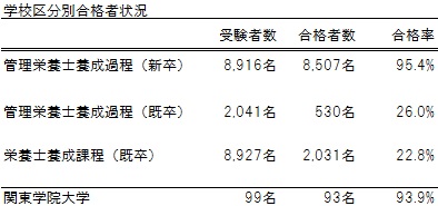 2015.05.14 お知らせ 第29回管理栄養士国家試験の合格率は93.9%でした。 平成27年3月22日に実施された第29回管理栄養士国家試験の結果について、平成27年5月8日に合格発表がありました。 合格された卒業生の皆さん、おめでとうございます。 今後益々のご発展をお祈り申し上げます。 惜しくも残念な結果となってしまった皆さん、努力は必ず報われます。次回の合格を目指して頑張ってください。 管理栄養学科 前の記事 一覧へ戻る 次の記事