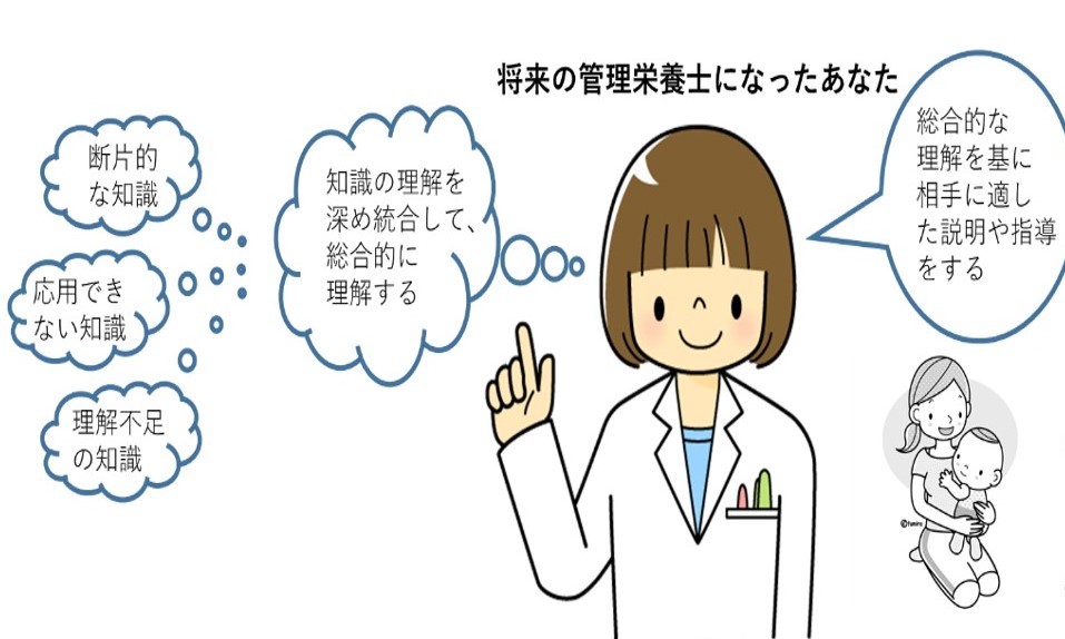 本学部が養成している管理栄養士の中心的な仕事に、栄養や健康に関して問題を抱えている人に対して、適切な指導をする業務があります。そのためには「雑学」では対応できません。単なる「知識」では、対象者に適する応用ができません。知識を応用した「知恵」が必要なのです。さらに、(ここが肝心です)その知識を、対象者に理解できる言葉で伝えなくてはなりません。この能力を高めるためにも「記述式問題」にチャレンジしてください。