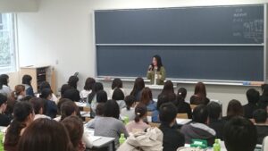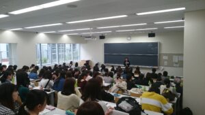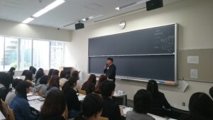 教員・スタッフの紹介後、履修登録の方法、資格や学生生活についての説明があり、