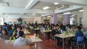 昼食は食堂に移動して、新入生、教員、お手伝いの4年生みんなでお弁当を食べて、親睦を深めました。