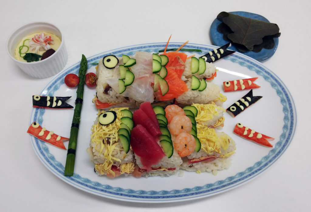 「端午の節句」鯉のぼりちらし寿司、茶わん蒸し、柏餅