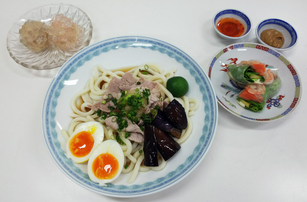 「梅雨」スタミナ冷やしうどん、生春巻き、紫陽花