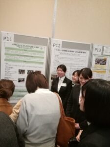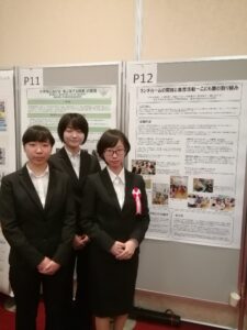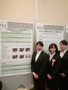 そこで、今回、3年生6名のゼミ生が、現役の栄養士・管理栄養士の発表に並び、2題のポスター発表を行ってきました。1題目の演題は、「ランチルームの開放と食育活動~こども園での取り組み」として、認定こども園で実施している「こどもの居場所づくり」について、ゼミ生が行った昼食作りや食育活動の内容について発表しました。2題目は、「小学校における「食に関する指導」の実践」として、横浜市内の小学校5年生の担任教諭と共に、食に関する指導を経験した内容について発表しました。