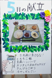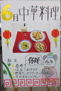 3年生の春学期のゼミナールⅠでは、月々のテーマを設定し、献立作成、食材の発注計画、調理と食事提供に係わる一連の過程を実習しています。その他、夏のオープンキャンパスでの「カフェ」および「ゼミ紹介」に向けての準備を行っています。4月は「ティータイム~ウエルカムパーティー~」、5月は「五月病に負けない」、6月は「野菜たっぷり中華」をテーマに献立作成を行いました。そして、オープンキャンパスでは昨年大流行したタピオカドリンクを提供しました。オープンキャンパスについては既に報告されていますので、このコラムではゼミのメンバーが自由に決めたテーマに基づいて作ったメニューをご紹介します。写真は、オープンキャンパスのゼミナール活動紹介用に制作したパネルです。