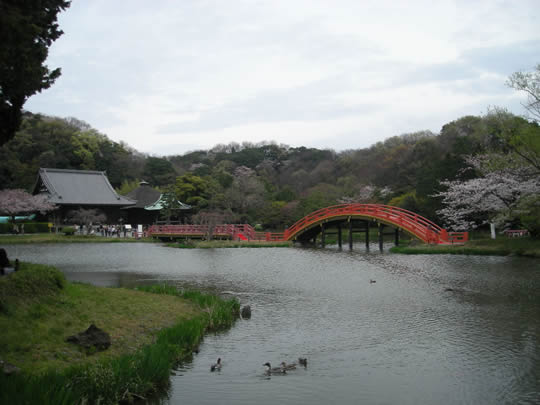 私も何度か訪れていてどの季節もそれぞれの趣があって良いのですが、桜の時期にはお寺に至る参道の桜並木がとてもきれいです。写真にある赤い橋は、以前にNHKの天気予報で映っていたと思います。また、背景にある小山は、ちょっとしたハイキングコースです。