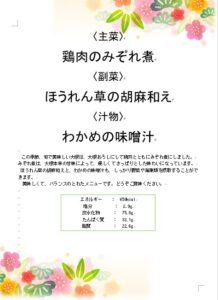 細山田研究室では、栄養・食事管理に関係する様々な活動を行っています。ゼミ生が考案した健康メニューを、実際に社員食堂で月1回のペースで提供していただく機会がありましたので、ご紹介したいと思います。