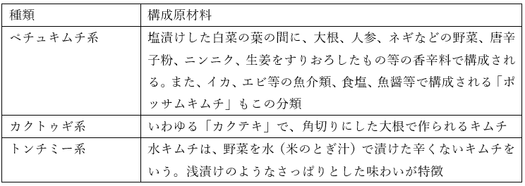 キムチは、「野菜および薬味と魚醤を使って漬け込んだ弱い呈味の調味漬け」と定義されており、野菜や薬味の多様な原材料を組み合わせるため種類も膨大だと考えられています。これらは大別すると、ペチュキムチ系、カクトゥギ系、トンチミー系(水キムチ)の3種に分類されます。特に、はくさいなどの菜類の葉の間に薬味を挟み込みつくったものがペチュキムチ系漬物といい、我が国では「キムチ」といえば多くはこれを指しています。