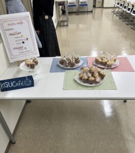 4年間のブランクで先輩からの引継もなく、また、ゼミ生の多くはコロナ禍であったため来訪者としての経験もない中で、ゼロから試行錯誤しながら計画・準備を行いました。新型コロナ感染症対策の制限はほぼなくなったとはいえ、感染者は増加傾向であるという状況をふまえ、イートイン、テイクアウトどちらでもよいように、焼き菓子はラッピングしてお渡しできるようにし、イートインや掲示スペースもゆったりとしたレイアウトにするなど工夫しました。カフェメニューは3種類のマフィン、コーヒーとフレッシュレモンウォーター、2日間で300個のマフィンをお渡しすることが出来ました。