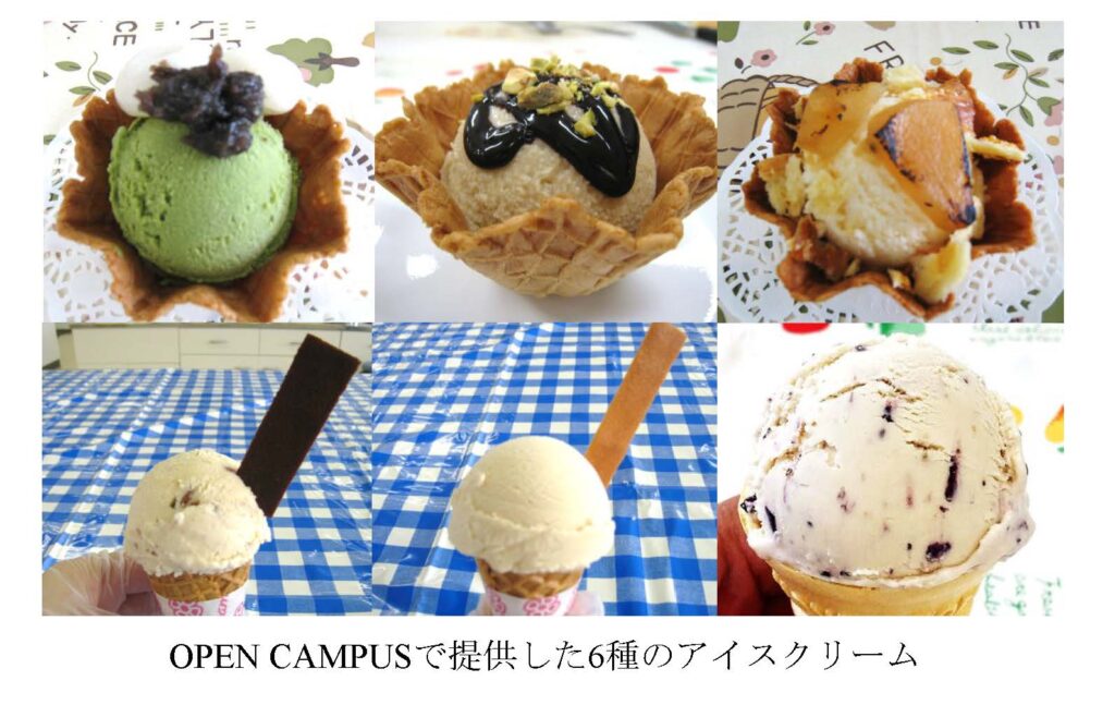 8月3・4日にオープンキャンパスが開催され、ゼミ生と卒業生も手伝ってくれ、昨年に引き続きアイスクリーム製造体験コーナーを実施しました。今年はこれまでの抹茶アイスクリーム(写真1左上)を大幅に見直し、抹茶を緑色が鮮やかな「おくみどり(福岡県産)」に変更し、手作りの粒あんと白玉を添えました。そのほか、チョコ・ピスタチオ(写真1中央上)、アップルコンポート・パイ(写真1右上)、生キャラメル&カカオラングドシャ(写真1左下)、紅茶&ラングドシャ(写真1中央下)、ブルーベリー・レアチーズ(写真1右下)の計6種を提供しました。両日とも猛暑の中2日間で約380食と多くの方にご来場いただき、学生も多くの方と接することで社会勉強になったと感謝しています。ありがとうございました。