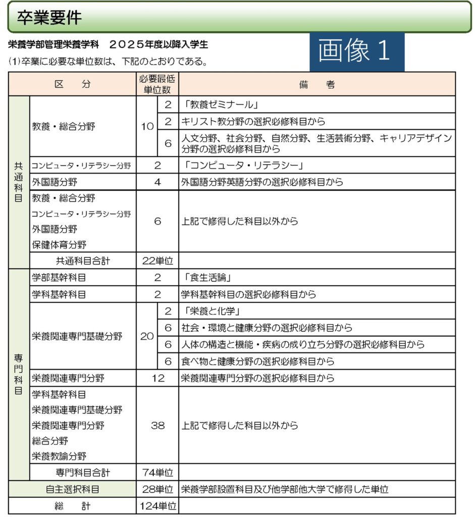 変更点の一つとして、1年生の春学期(4~7月)に「栄養と化学」という科目が新設され、この科目は食品衛生管理者および食品衛生監視員の資格(任用資格)に必要であると同時に、「卒業必須科目」(卒業までに必ず単位を修得する必要がある科目)となっています。大学を卒業するためには、所定の単位を修得して卒業要件を満たす必要があります。「画像1」に記載されているように、分野ごとに指定されている科目の単位数の合計「124」単位が卒業に必要な単位数となります(管理栄養士国家試験の受験資格を取得するためには、それ以上の単位を修得する必要があります)。